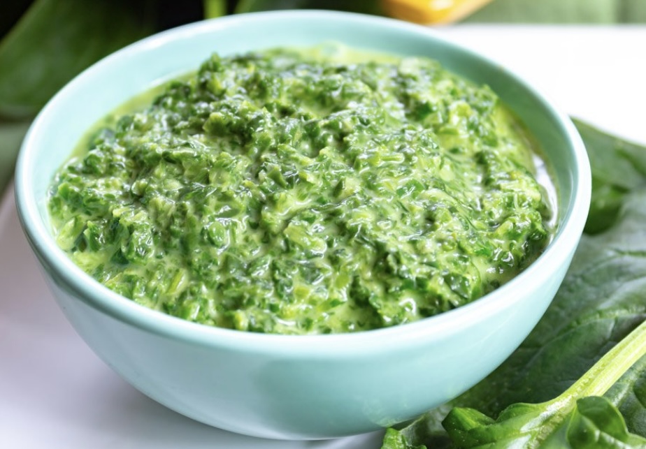 Den tiefgekühlten Rahmspinat auftauen, mit etwas Salz, Pfeffer und Muskat nachwürzen, in einer kleinen Pfanne erhitzen und fertig.