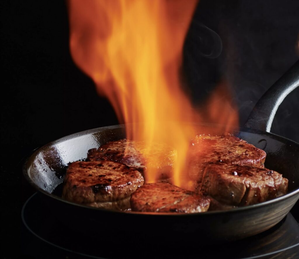 Die Filetstücke salzen und pfeffern, kurz und sehr heiss anbraten, wieder aus der Pfanne nehmen. Im Bratensatz die Zwiebel und der gemahlene Pfeffer andünsten bis sie golden ist, dann mit Bouillon ablöschen. 4 Spritzer Ketchup, 4 Spritzer Worcestershire beigeben. Fleisch wieder in die Sauce geben, Cognac und Madeira beifügen und sofort flambieren. Sobald die Flammen erloschen sind, Rahm beigeben.