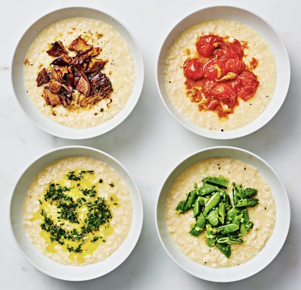 Das Grundrezept eines Risottos ist immer das gleiche mit Reis, Zwiebeln, Weisswein und Bouillon. Ich ändere es immer wieder gerne ab. Entweder mit, Prosecco, Champagner, Roséwein oder sogar Rotwein. Auch bei den Geschmacksrichtungen lasse ich mich immer wieder von meiner Fantasie und meinen Gelüsten leiten. So kann es gut sein, dass ich einmal grosse Lust auf Pilze habe, seien dies Champignons oder Morcheln, Steinpilze oder andere. Ein anderes Mal möchte ich gerne klein gewürfeltes Gemüse darin. Einmal sind es Spargelspitzen, dann wieder Zitronenzesten und Rosmarin. Anstelle von gehackten Zwiebeln können auch gut gehackte, karamellisierte Zwiebeln verwendet werden.